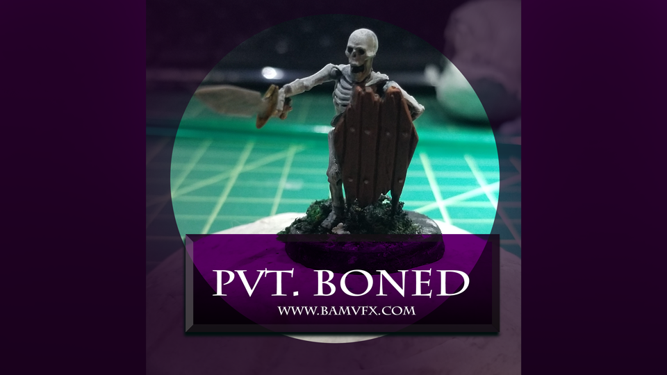PVT Boned. The first of the BAMvfx Skeleton Army. Pvt Boned is sent in front of the main line to trigger ambushes. Outside of that he has no skills to contribute. Warhammer miniature of Age of Sigmar. Pvt. Boned is the second model I ever painted and I cannot wait to complete the rest of the army and more.Â